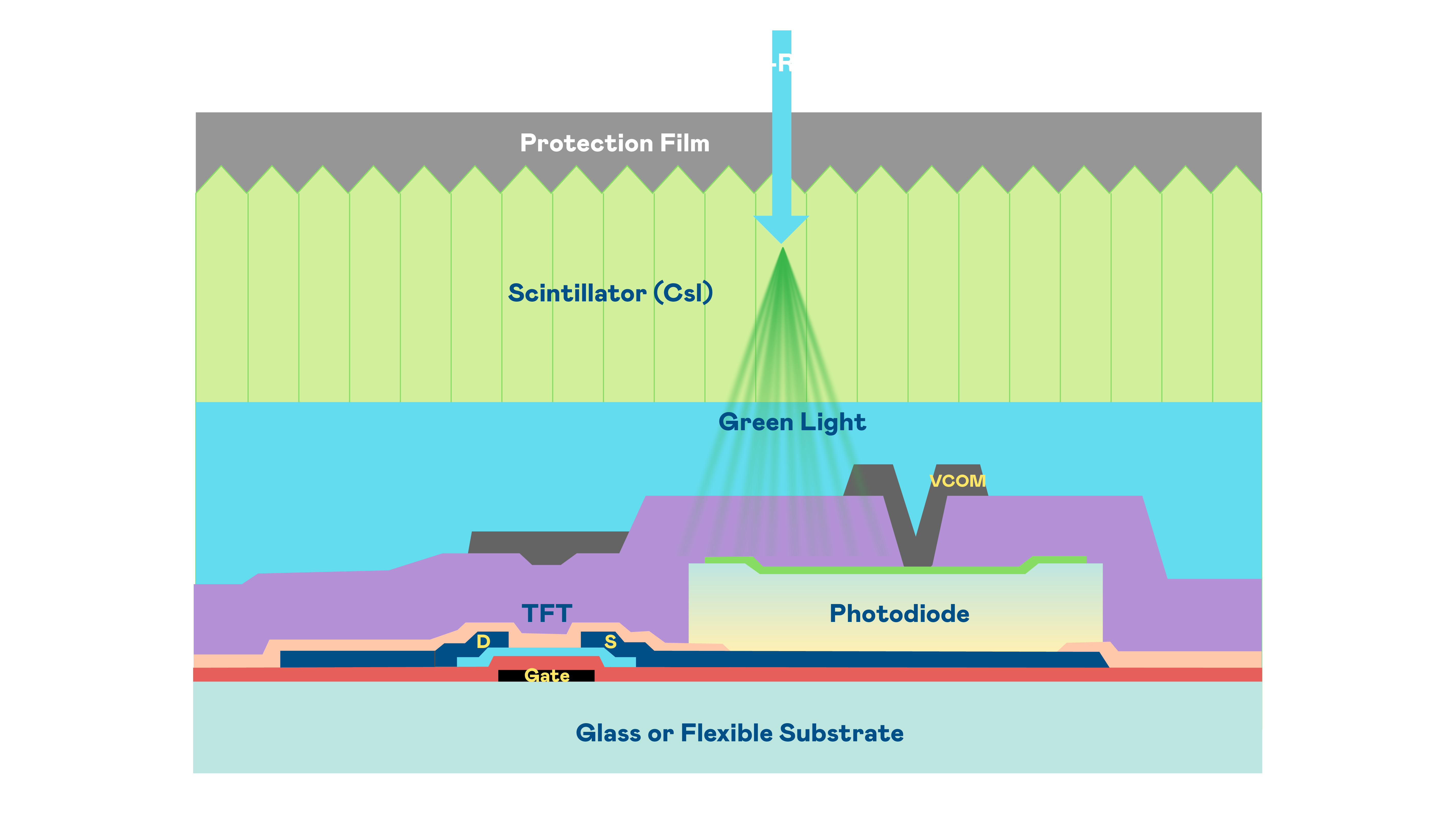 ks凯时的X光影像感測陣列使用薄膜電晶體 (TFT) 作為每個像素的讀取開關,搭配光電二極體(Photodiode)的光電轉換元件,用以感測X光影像訊號。